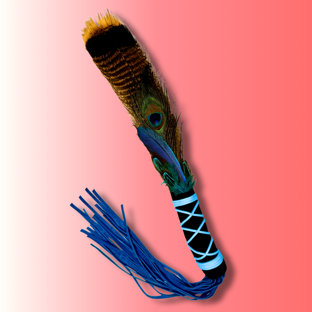 The handle is made of black suede leather, wrapped with a light blue leather tie to accent and royal blue leather tassels, bringing together a stunning tool for sacred ritual, clearing your energy and others, or gifting to a beloved soul on their spiritual path.