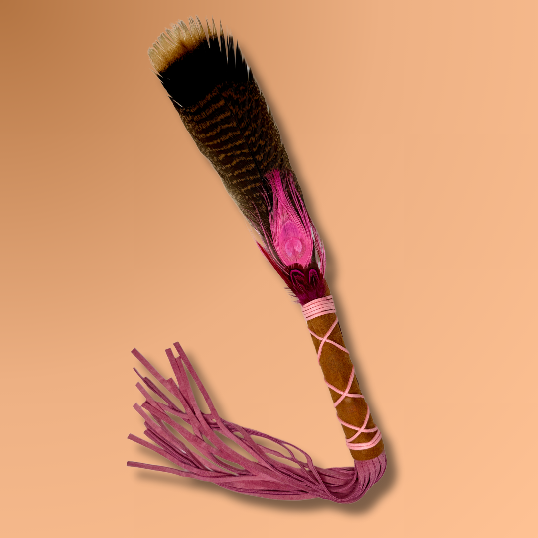 Featuring a large Turkey feather symbolizing abundance and sacred giving, a luminous Pink Peacock feather adds a layer of beauty, protection, and transformation, and accented with magenta Goose feathers for loyalty, community, and the call to follow your soul’s true path.