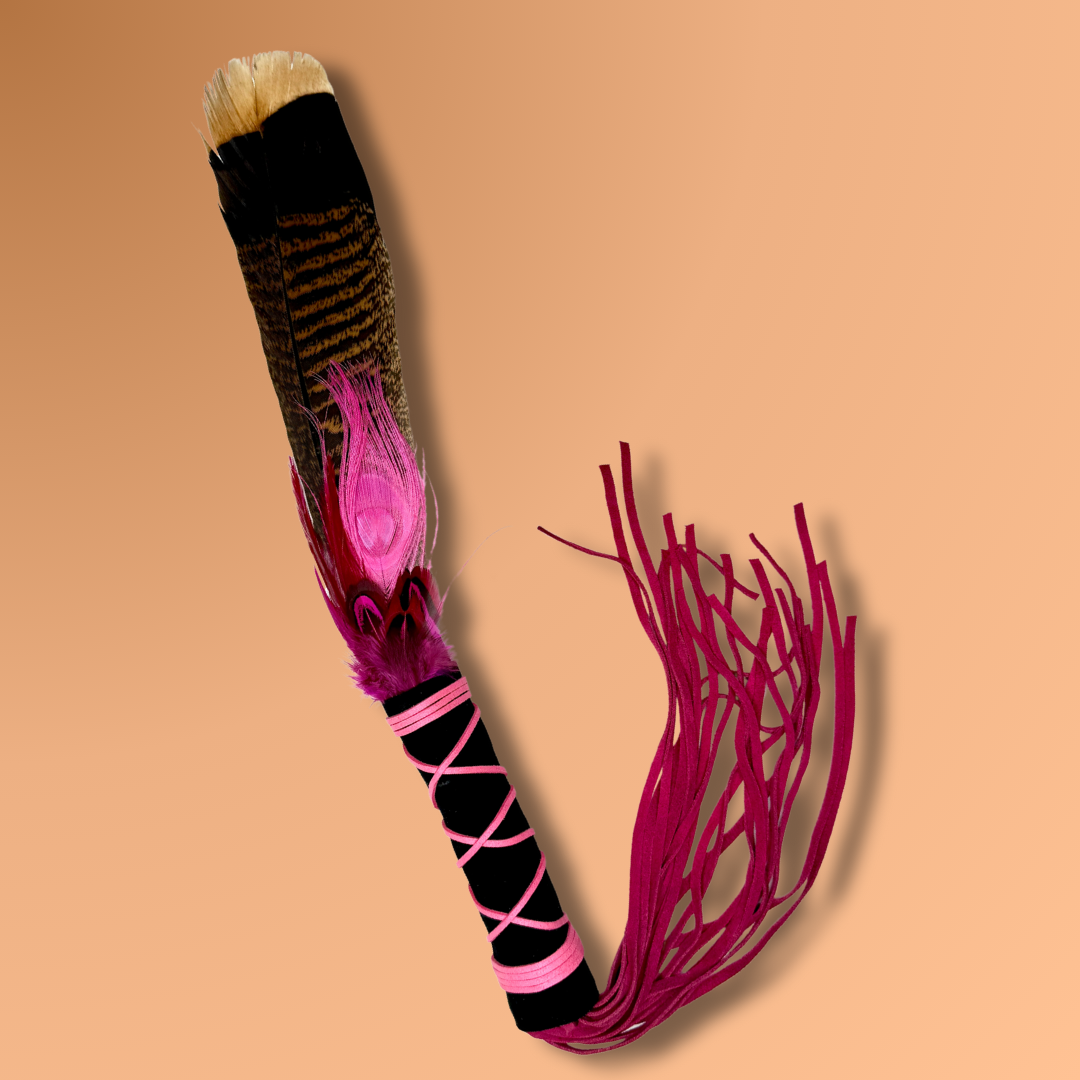 Featuring a large Turkey feather symbolizing abundance and sacred giving, a luminous Pink Peacock feather adds a layer of beauty, protection, and transformation, and accented with magenta Goose feathers for loyalty, community, and the call to follow your soul’s true path.