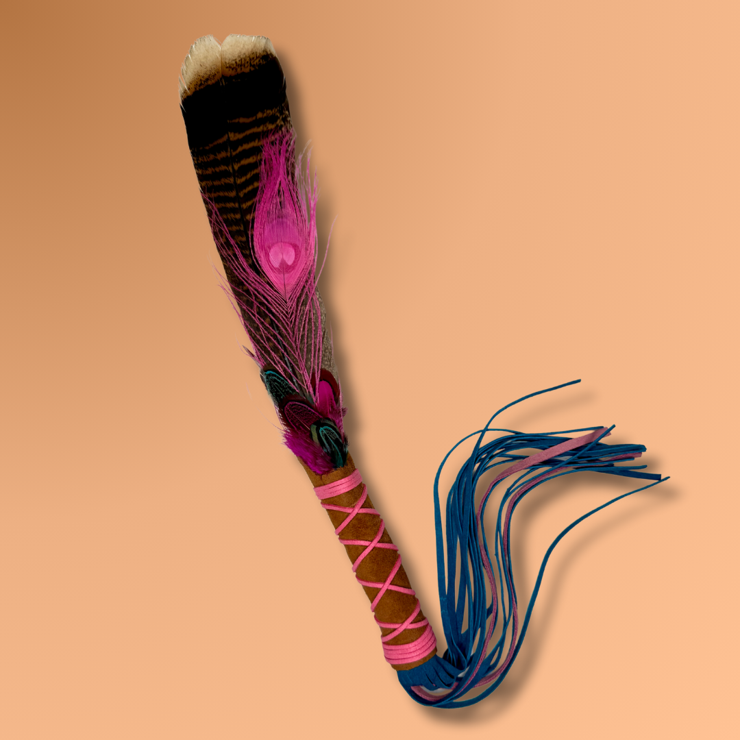 The handle is made of tan suede leather, wrapped with a pink leather tie to accent and turquoise & pink leather tassels, bringing together a stunning tool for sacred ritual, clearing your energy and others, or gifting to a beloved soul on their spiritual path.